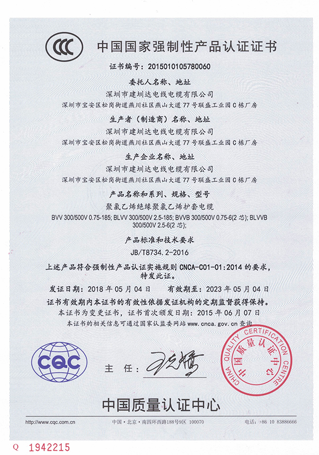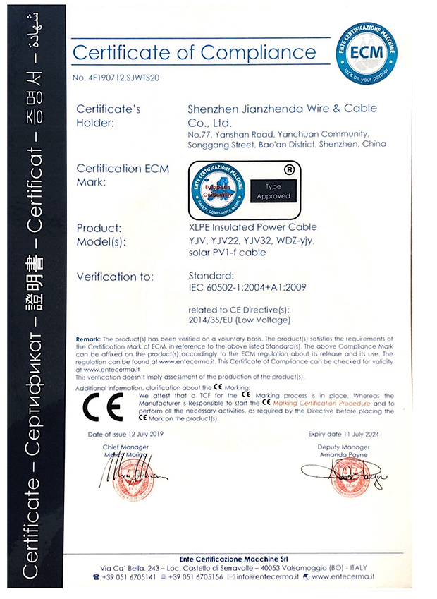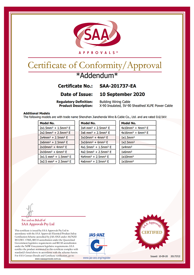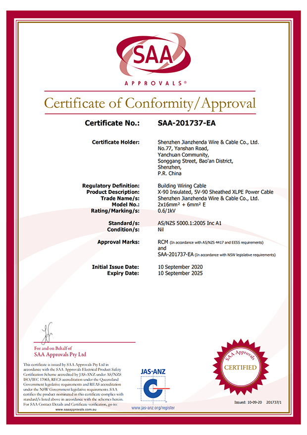深圳建圳達電線電纜有限公司,成立于2000年,是一家電線電纜制造商,我們通過了世界各地不同市場的多數認證,如:CCC、RoHS、CB、SAA、TUV、VDE、PSE、BPS、UL、CSA。我們根據定制產品不斷更新新的認證。經過數十年的發展,我們與來自世界各地的客戶建立了長期的合作關系。我們曾經是菲律賓機場,,柬埔寨的電力站,美國的醫院,工廠,埃塞俄比亞的水電站項目。我們是一家值得信賴的電線供應商。